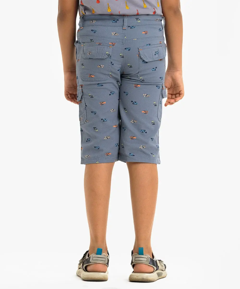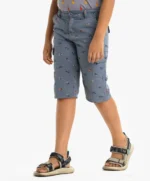 Kid boys printed three-quarter pant in cotton fabric. Zipperfly and a button fastening at the front. Four pockets at the front and two patch pockets on the back.