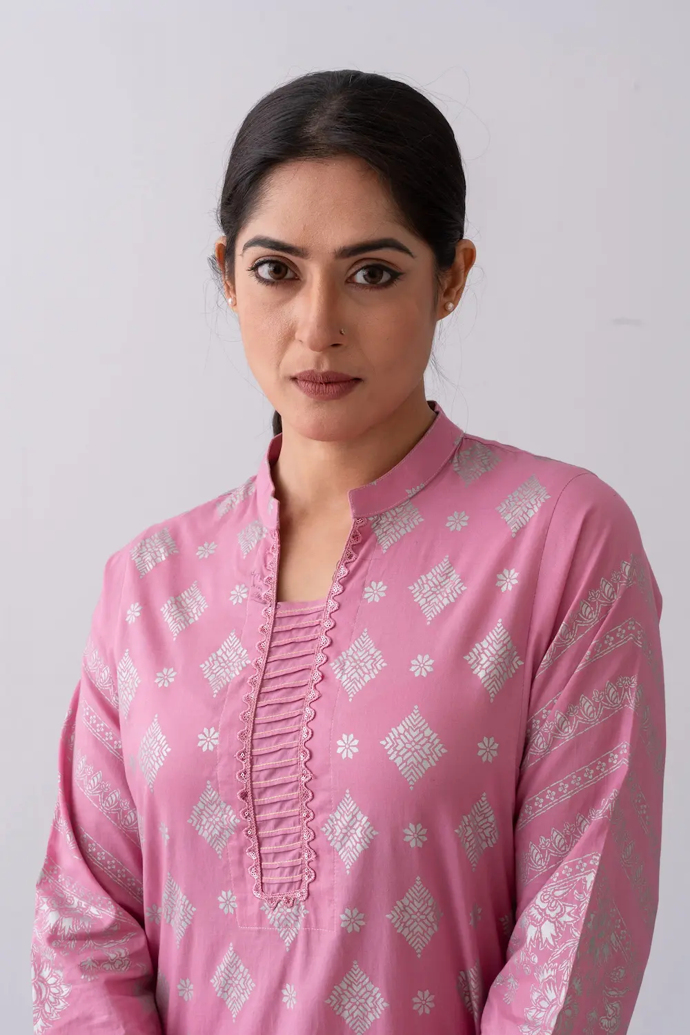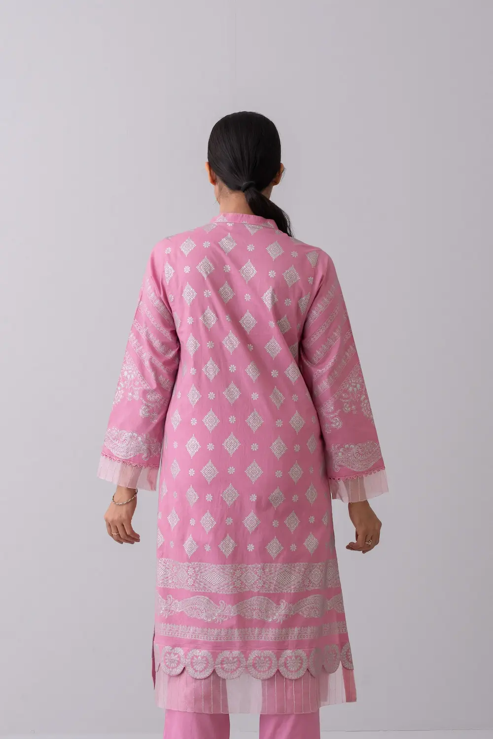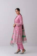 Elevate your elegance with our stunning ready-to-wear 3 Piece Lawn Salwar Kameez Suit, embellished with metallic print and intricate lurex embroidery on the front and sleeves. Accented with decorative lace and pintucks with golden lurex chain stitch detailing at neck, this ensemble is paired with a solid color relaxed pant and a luxurious handloom yarn dyed silk dupatta.Perfect for festive occasions or adding a sophisticated touch to your everyday wardrobe.